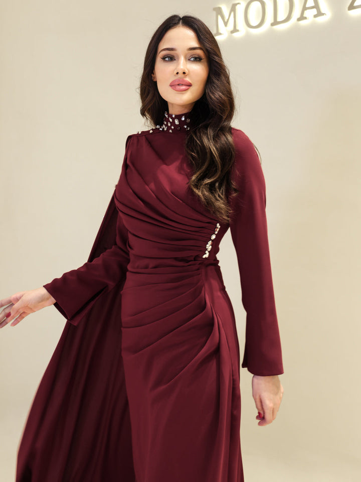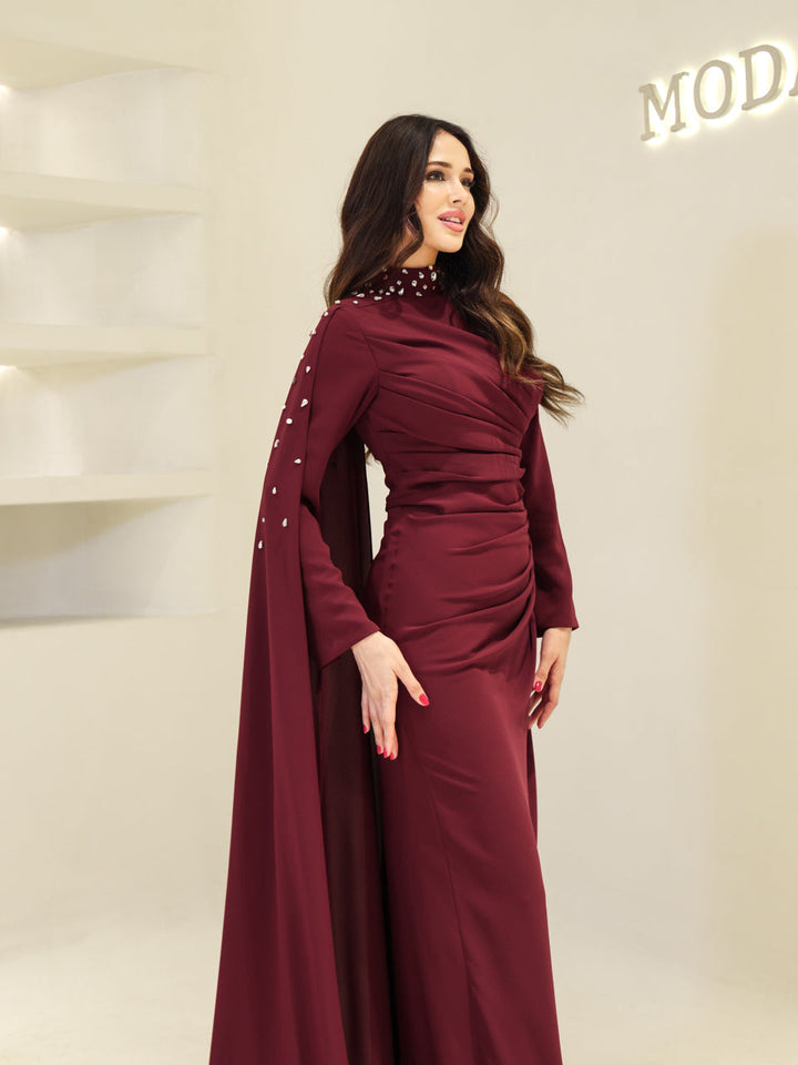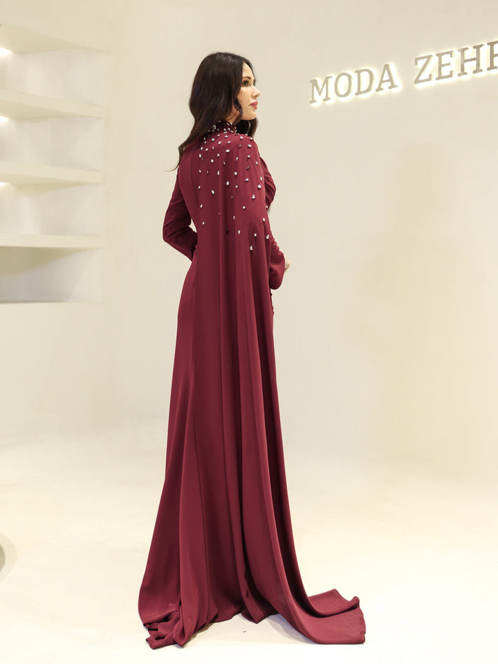 Sağ omuzdan arkaya uzanan pelerin detayı mevcuttur