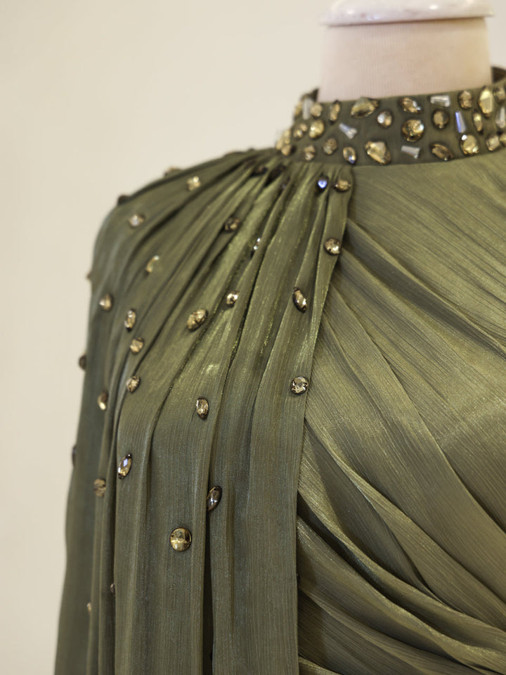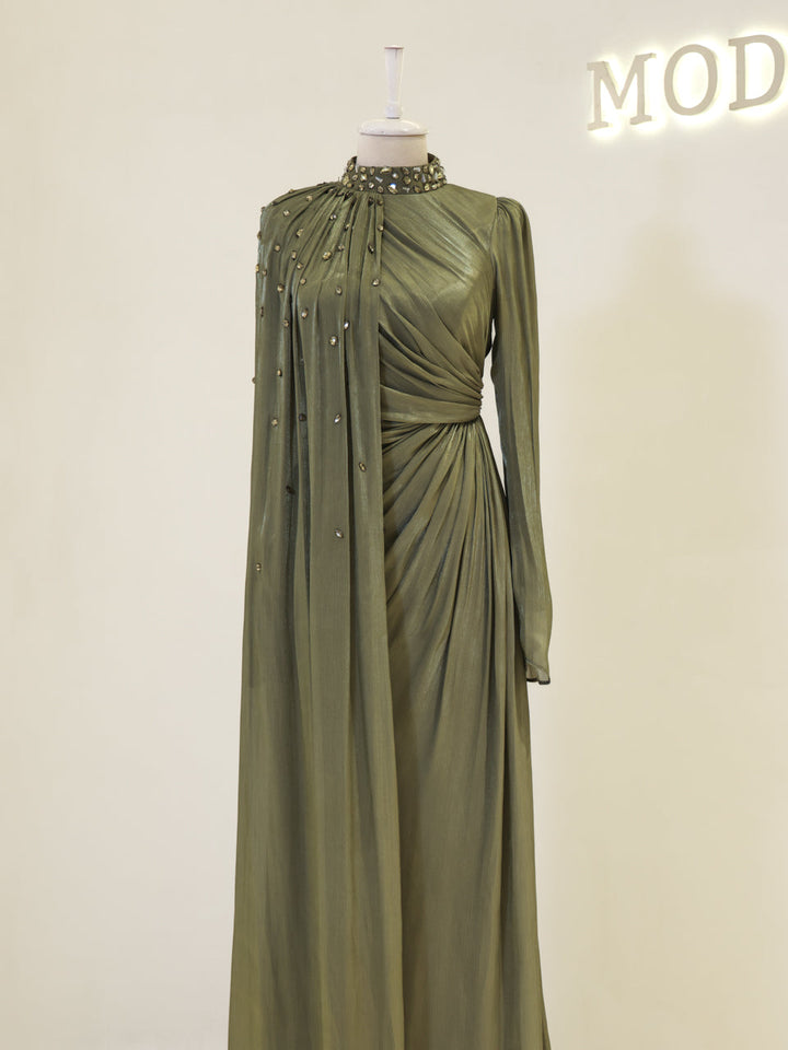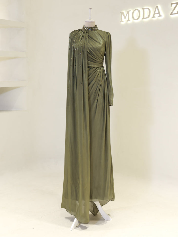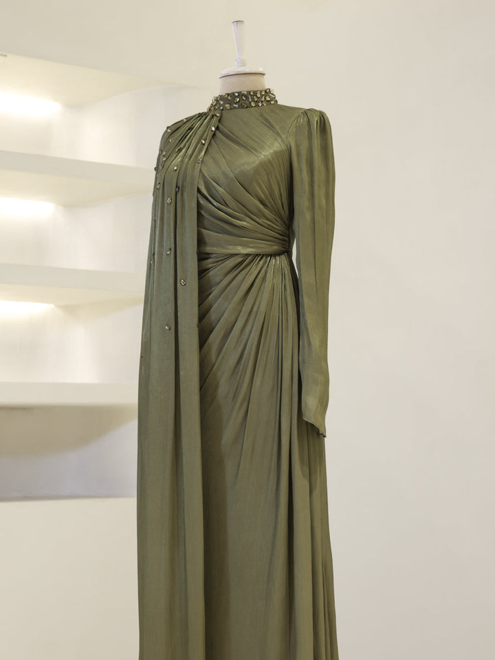 Sağ omuzdan etek ucuna kadar uzanan pelerin detayı mevcuttur