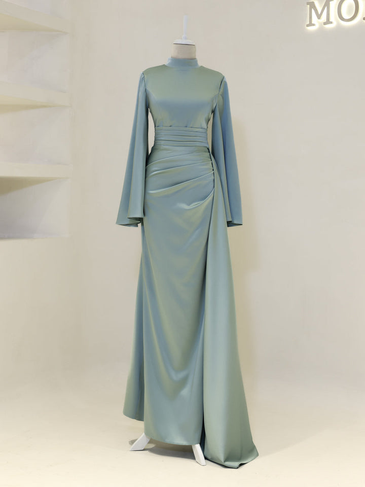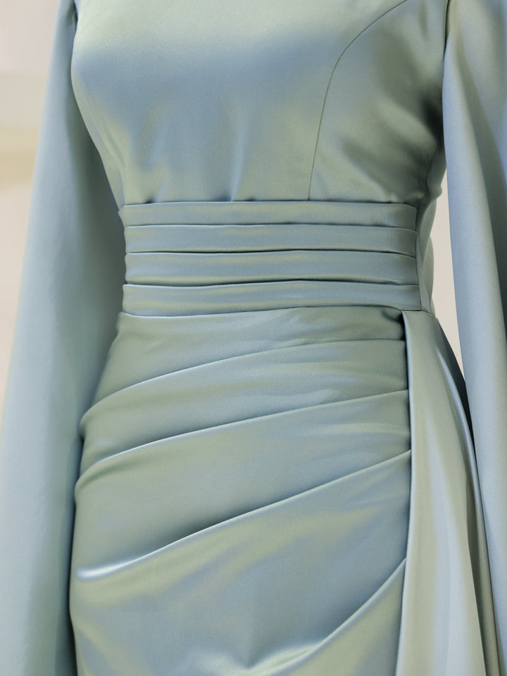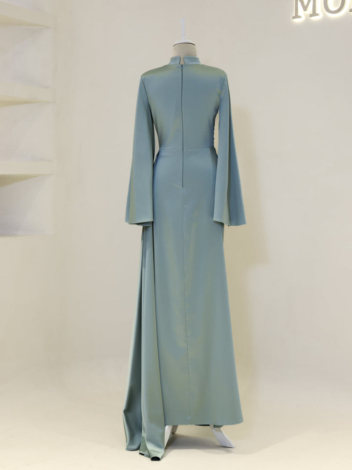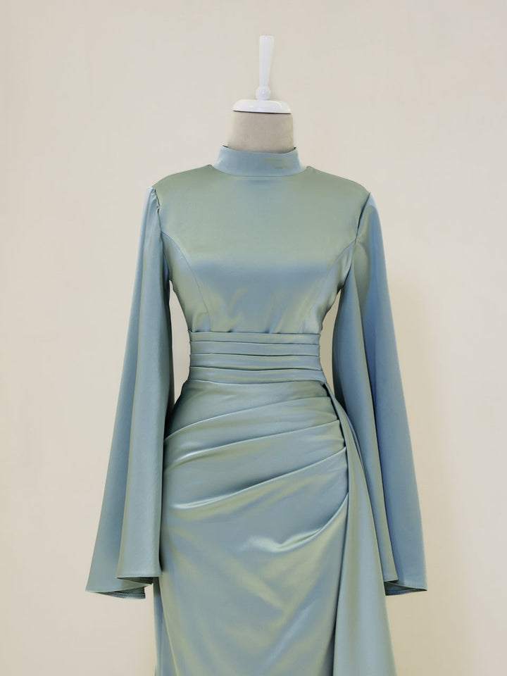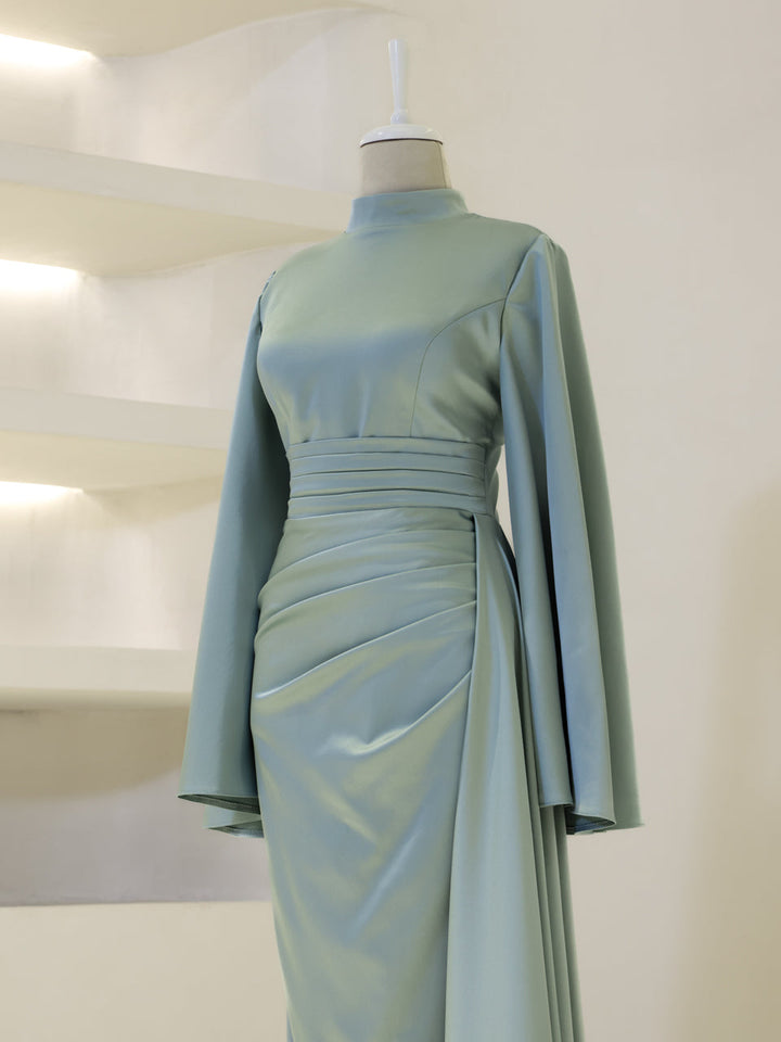 Belinde ve etek kısmında drape detayları vardır Sol etek kısmında pelerini mevcuttur Çan etek formuna sahiptir.