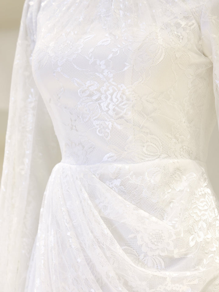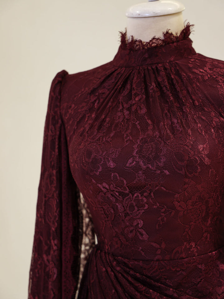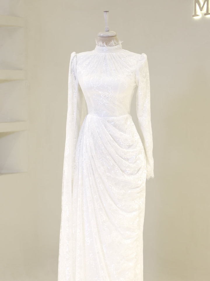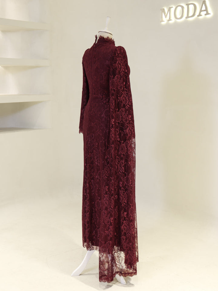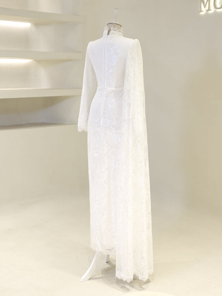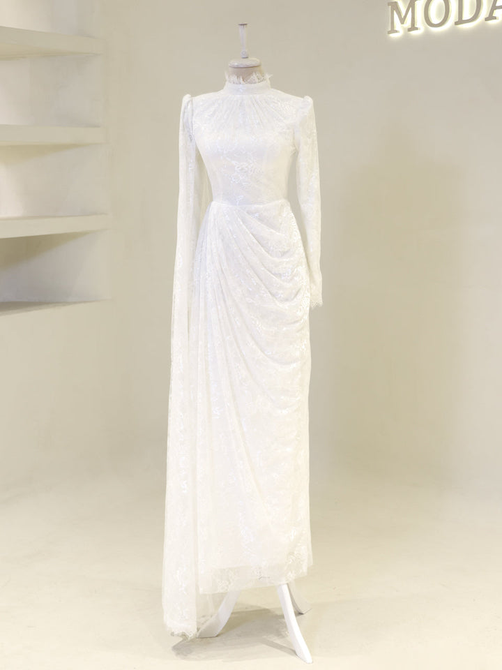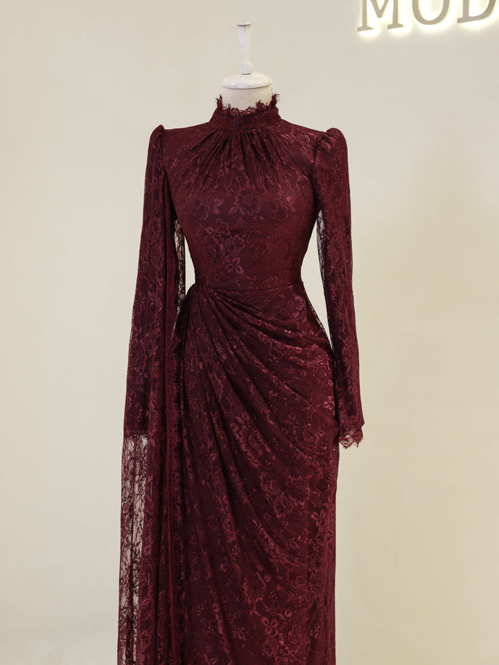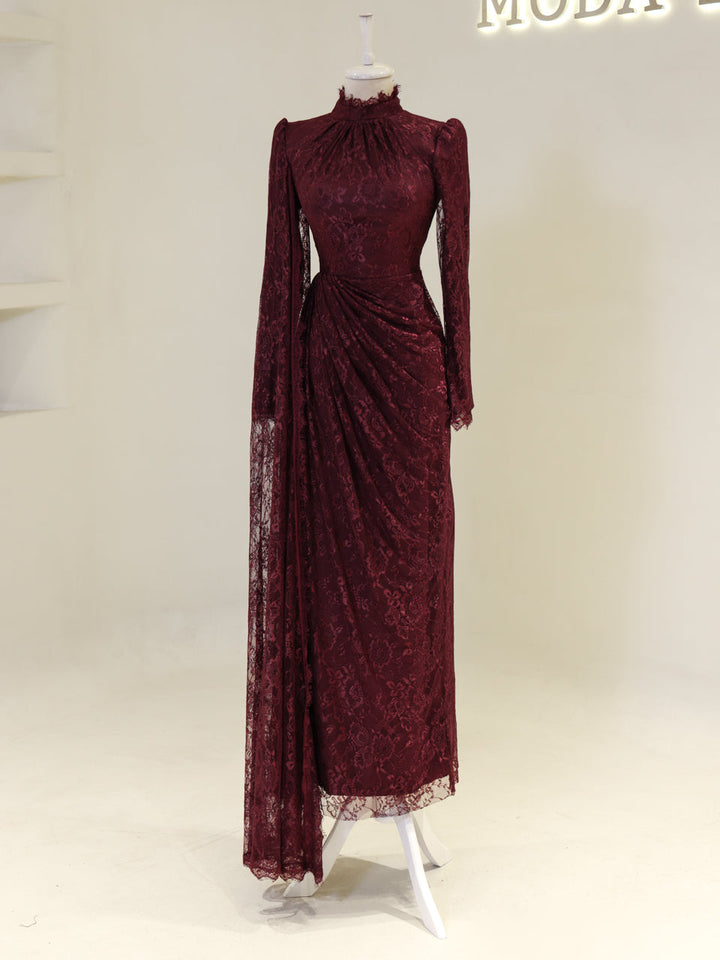 Sağ omuzdan etek ucuna kadar uzanan pelerin detayı mevcuttur