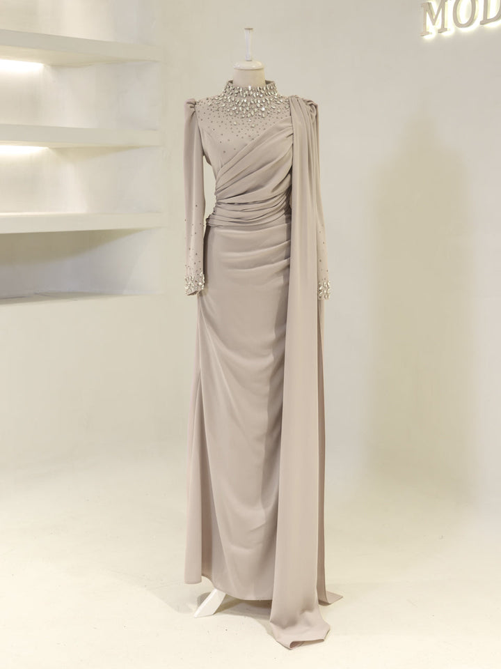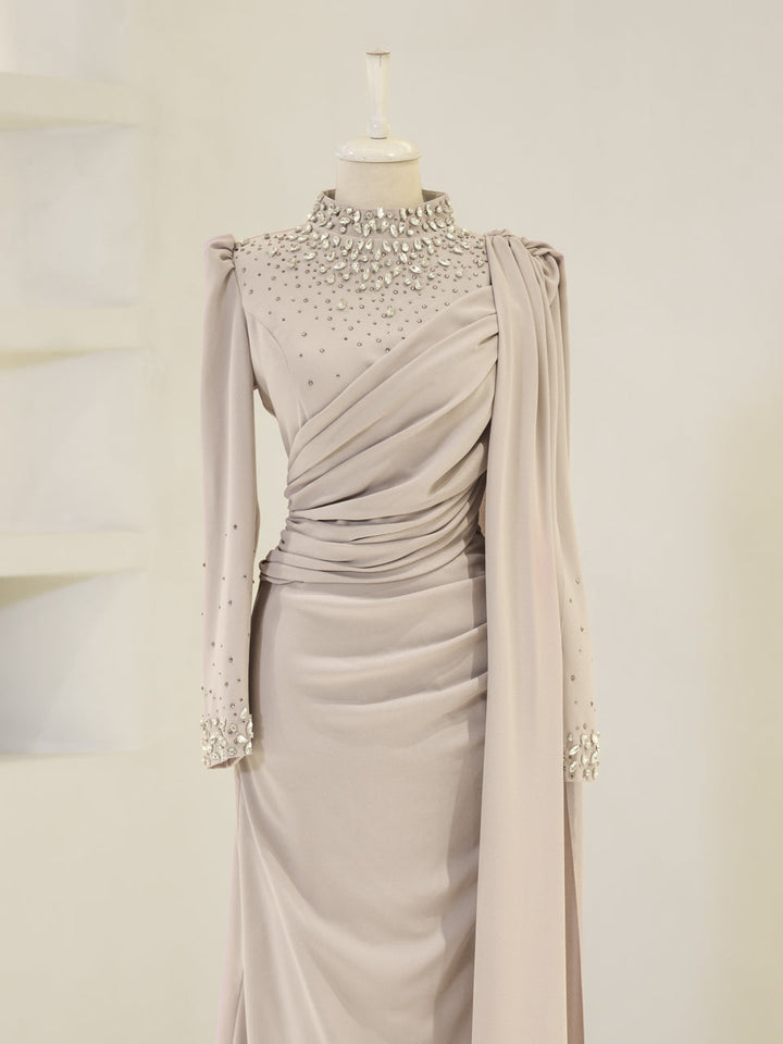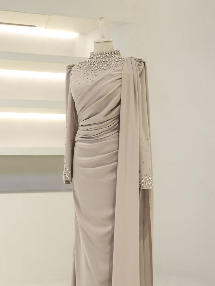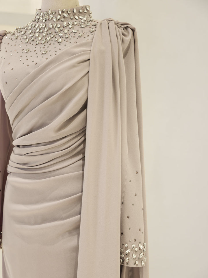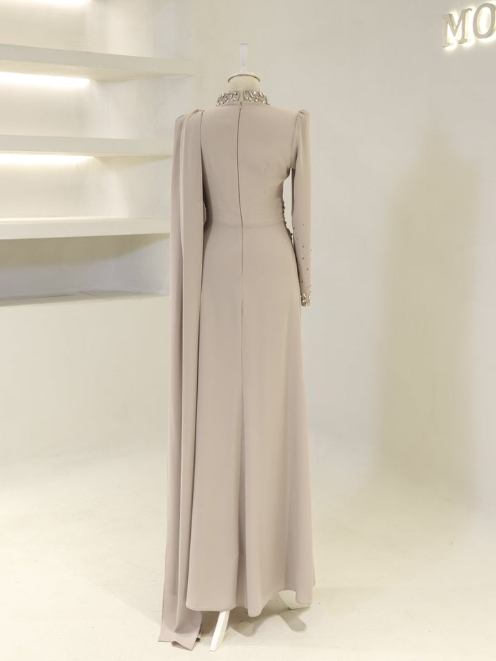 Sol omuzdan yere kadar uzanan pelerin detayı mevcuttur