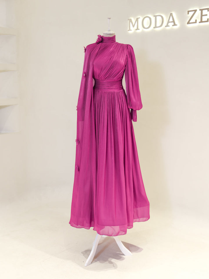 Sağ omuzdan etek ucuna kadar uzanan pelerin detayı mevcuttur